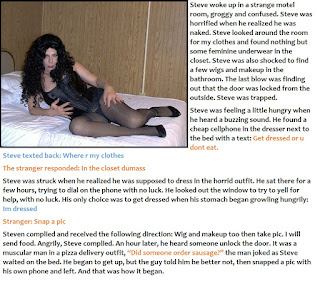 Hey there. It has been a LONG time since I last posted something on here and just wanted to assure you all that I am not dead. Just been busy with a few things. I am actually on here hoping to get some feedback and comments and such from my followers/visitors. I started taking a 'Dramatic Stage Makeup' class this week that is taught by a local dragqueen. I am hoping to learn quite a bit. In preparation for it, my friend Taylor (a fantastic author on Fictionmania who wrote the story College Changes a Boy) sent me a new outfit to wear. It was really nerve-wracking for me because I am really beginning down this new path of trying to shirk off my normal masculine identity and transition more towards something twink/femboi.